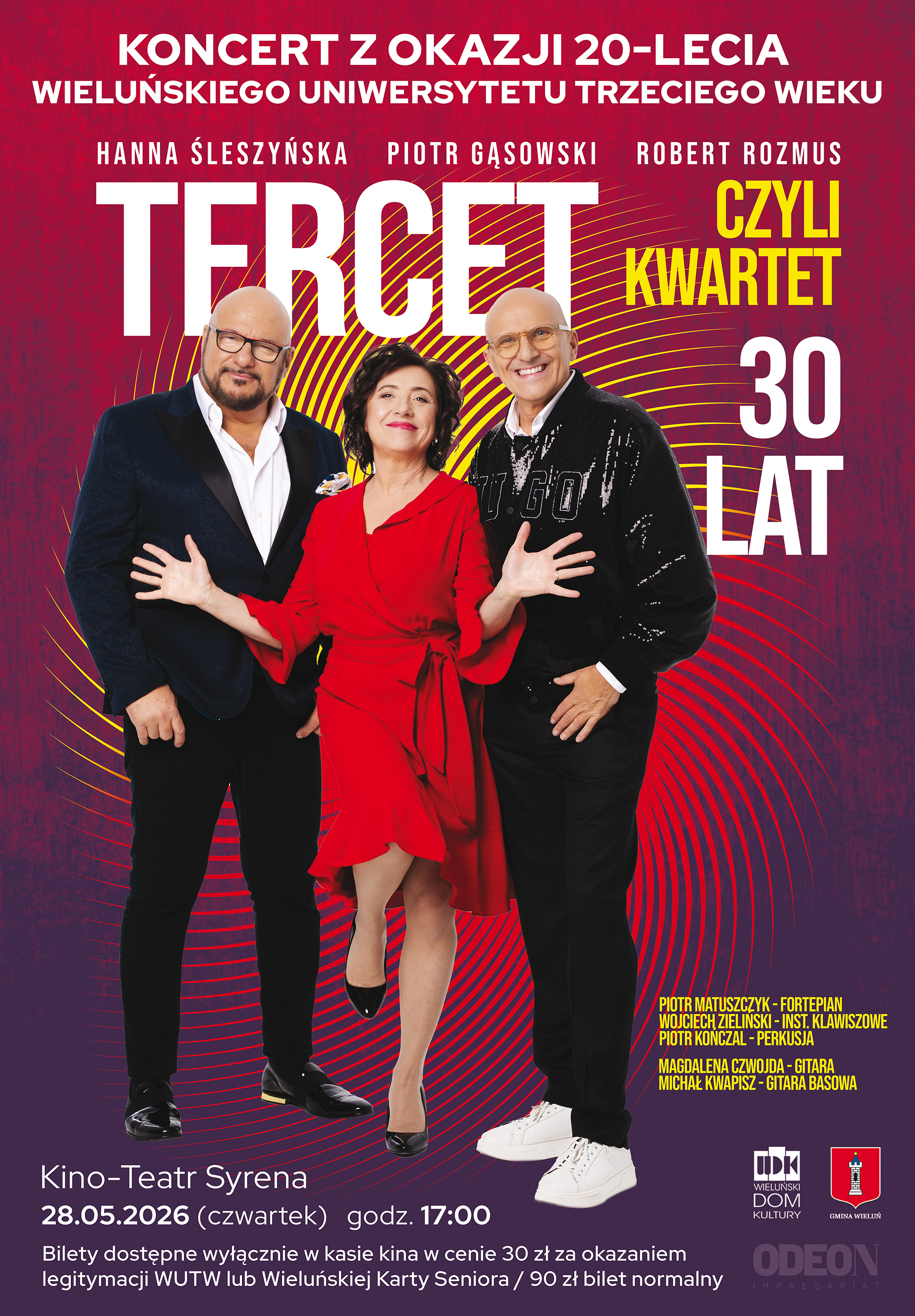 Czytaj więcej20 lat Wieluńskiego Uniwersytetu Trzeciego Wieku Z tej wyjątkowej okazji zapraszamy na koncert jubileuszowy, który łączy doświadczenie, energię i doskonały humor sceniczny. Na scenie wystąpią: Hanna Śleszyńska, Piotr Gąsowski i Robert Rozmus – artyści, których nie trzeba przedstawiać. W programie „TERCET, czyli KWARTET 30 lat” usłyszymy znane i lubiane utwory, okraszone inteligentnym dowcipem i sceniczną charyzmą. Kino-Teatr Syrena 28...