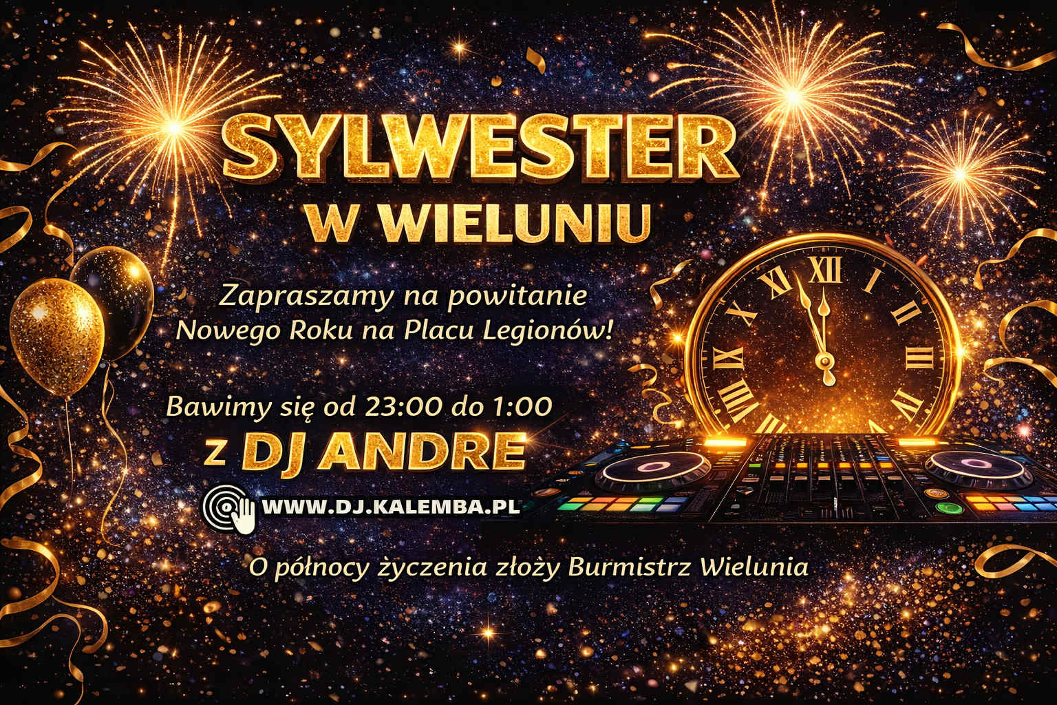 SYLWESTER W WIELUNIU Zapraszamy mieszkańców Wielunia i okolic na wspólne powitanie Nowego Roku na Placu Legionów! Start: 23:00 Koniec: 1:00 Muzyka: DJ ANDRE Czekają na Was świetna muzyka, wyjątkowa atmosfera i wspólne odliczanie do Nowego Roku wraz z Burmistrzem Wielunia Pawłem Okrasą.