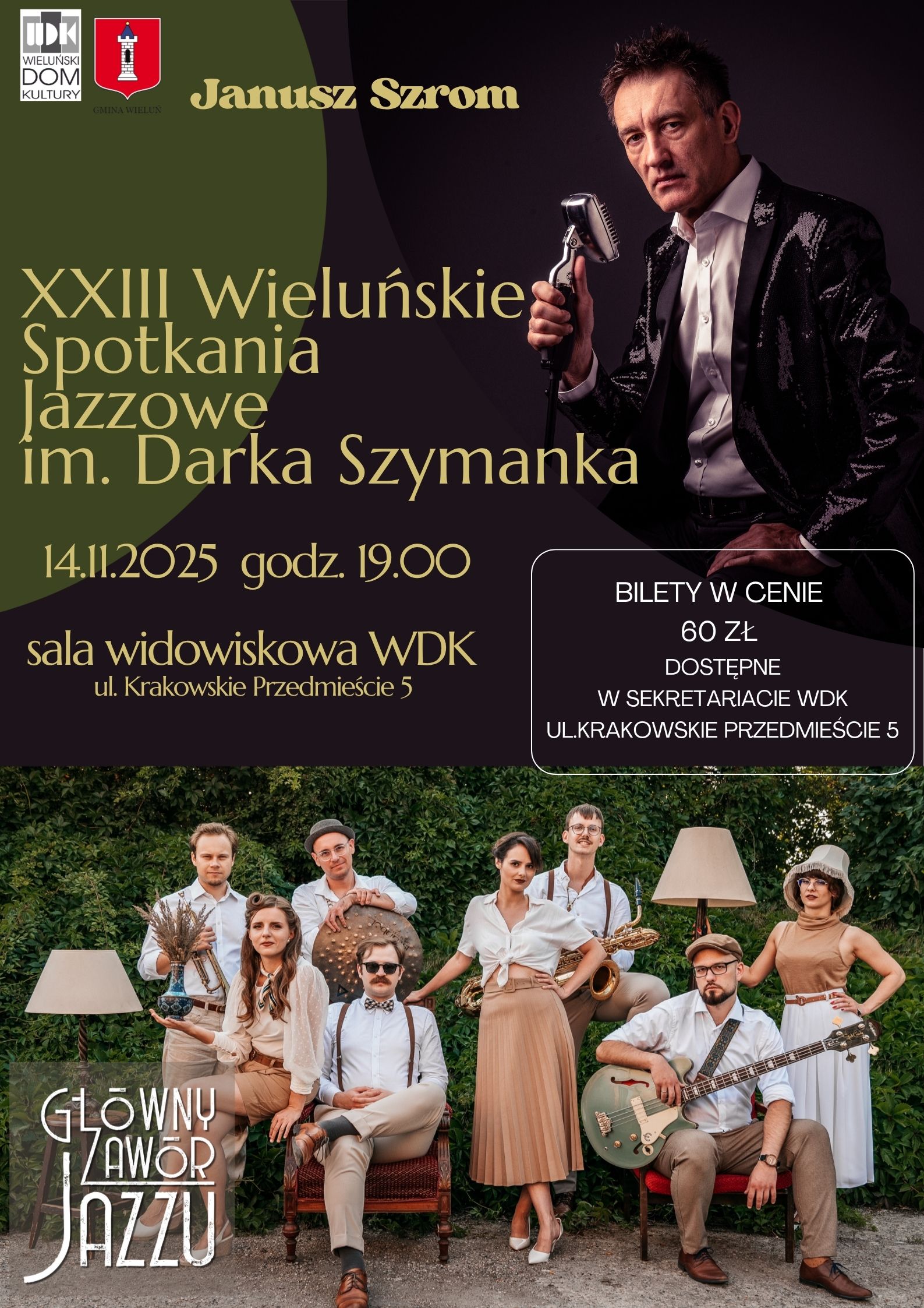 Serdecznie zapraszamy na XXIII Wieluńskie Spotkania Jazzowe im. Darka Szymanka, które odbędą się 14 listopada 2025 r. o godz. 19:00 w sali widowiskowej WDK (ul. Krakowskie Przedmieście 5). Wystąpi znakomity Janusz Szrom wraz z Pawłem Perlińskim oraz zespół Główny Zawór Jazzu – gwarancja wyjątkowych muzycznych emocji i niezapomnianej atmosfery. Bilety w cenie 60 zł dostępne są w sekretariacie WDK. Nie przegap tego wyjątkowego wieczoru!