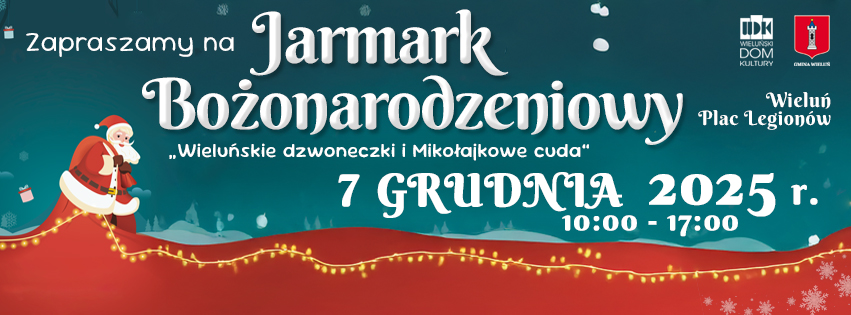 Wieluń już pachnie świętami! Serdecznie zapraszamy na Jarmark Bożonarodzeniowy „Wieluńskie dzwoneczki i Mikołajkowe cuda”! 7 grudnia 2025 r. 10:00 – 17:00 Plac Legionów, Wieluń Czeka na Was cała moc atrakcji: - stoiska wystawiennicze pełne wyjątkowych prezentów - mikołajkowe zabawy, karuzele i warsztaty świąteczne dla dzieci - spotkanie z Mikołajem, który osobiście będzie wręczał prezenty dostarczone przez „swoich pomocników” - konkurs na najpiękniej ubraną choinkę...