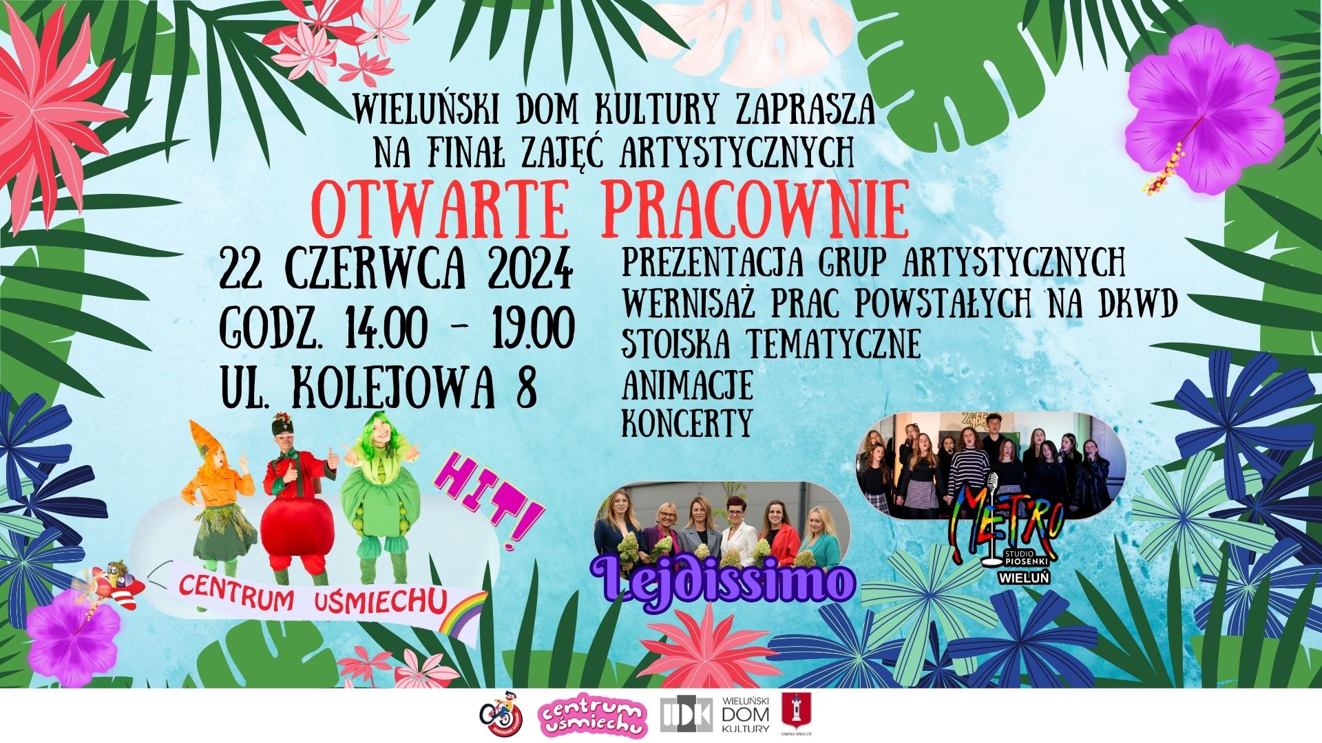 Zapraszamy na wyjątkowe wydarzenie na DKWD! Otwarte Pracownie to impreza podsumowująca rok pracy naszych grup warsztatowych, instruktorów oraz pracowników Wieluńskiego Domu Kultury. Zaplanowaliśmy dla Państwa wiele atrakcji na ten dzień, a mianowicie: zwiedzanie pracowni DKWD, wernisaż prac powstałych na warsztatach, prezentacja grup baletowych, możliwość udziału w warsztatach artystycznych, animacje ruchowe, konkursy oraz oczywiście koncerty! Na scenie zaprezentują się Państwu zespoły: Studio Piosenki Metro Wieluń oraz współpracujący z WDK-LEJDISSIMO. Gwiazdą wydarzenia będzie CENTRUM UŚMIECHU-wykonawcy takich dziecięcych hitów jak: Olimpiada w Jarzynowie, Gruszka czy Inspektor Ogórek.